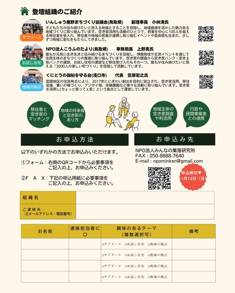 1月12日(月)までに申込みフォーム、FAXまたはメールで、特定非営利活動法人みんなの集落研究所までお申込みください。
