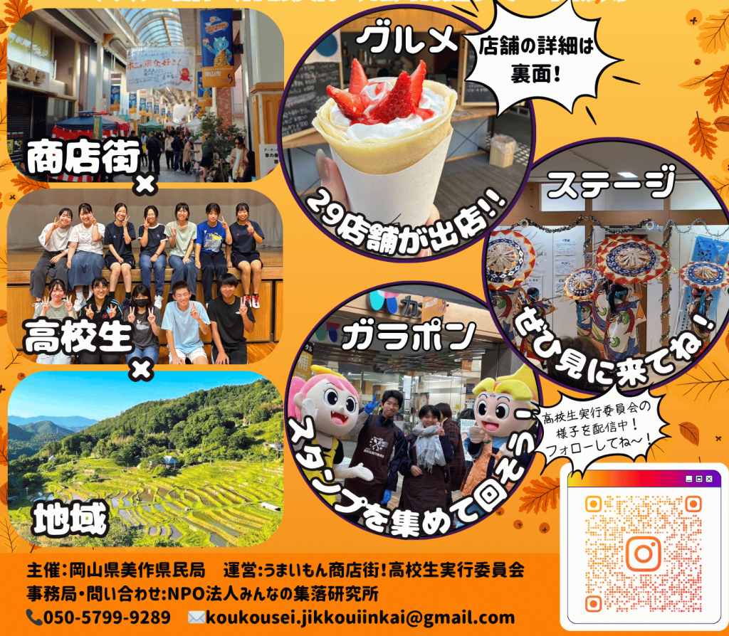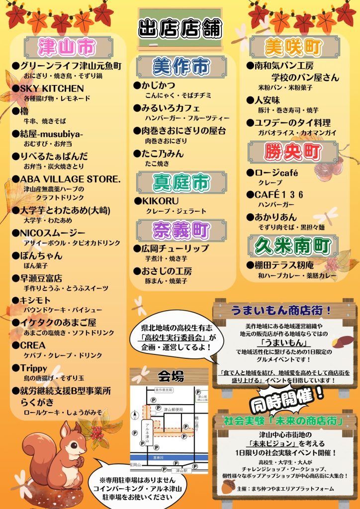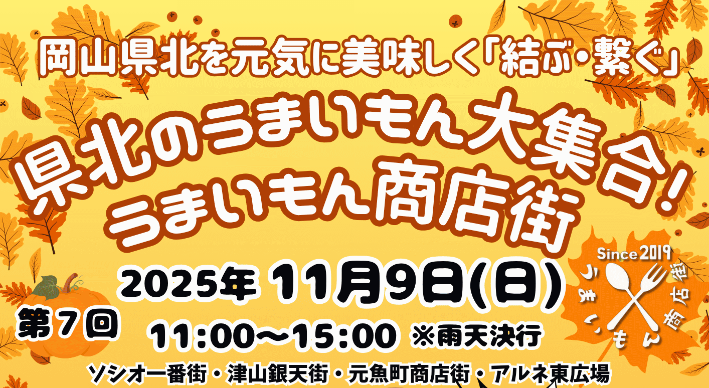 本イベントは岡山県北を美味しく元気に「結ぶ・繋ぐ」の高校生が企画・運営するグルメイベントで、今年は高校生おすすめのうまいもんが県北各地から29店舗が集結!また、津山中心市街地の未来ビジョンを考える社会実験イベント「未来の商店街」も同時開催!